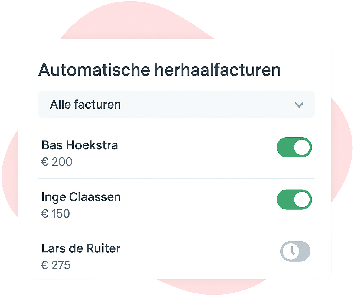 Zeg vaarwel tegen handmatig terugkerende facturen maken. Stel één keer in, kies de frequentie en onze software doet de rest. Zo krijg je op tijd betaald, zonder dat je er elke maand aan hoeft te denken.